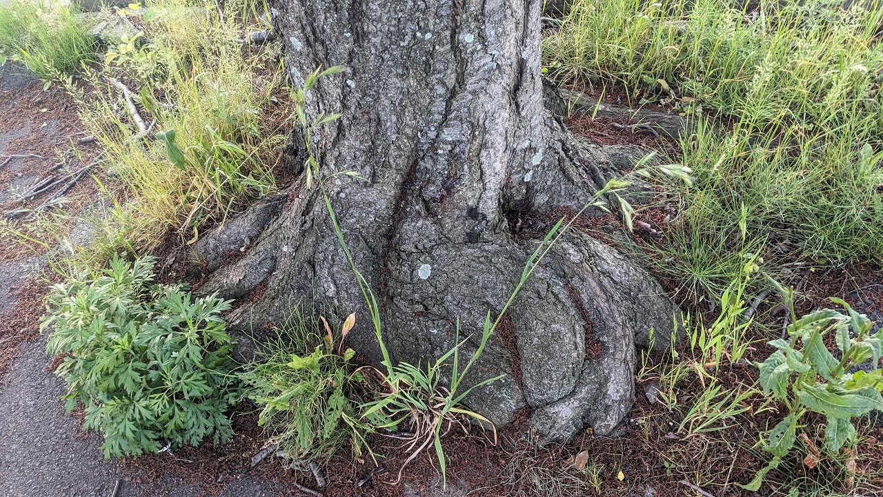 行き場のない根部はその場で太く膨らみます。写真のような根元の膨らみは、固結土が原因でこのようになったのかもしれません。