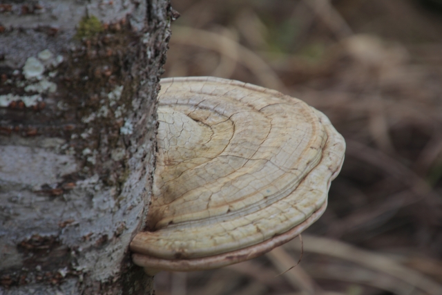 コフキサルノコシカケは、樹木が病気にかかって菌類に侵されている証拠と言えます。担子菌の胞子が幹や根部の傷口から侵入し、その後樹体内を腐朽して広がります。十分に広がった担子菌は、子実体であるキノコを発生させ、再びキノコから胞子を放散します。キノコの形で菌類を特定できるわけですが、写真のようなキノコはコフキサルノコシカケと呼びます。