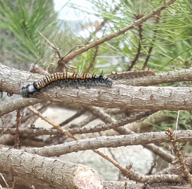 この葉が少なくっている原因は、写真中央に写っている毛虫が食害したことです。黒い5cm程度のこの毛虫は、クロマツやヒマラヤスギを好んで食害するガの幼虫で、マツカレハと呼ばれます。